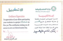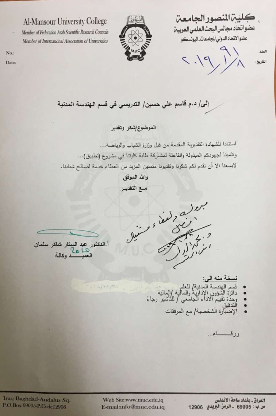 حصل الدكتور قاسم علي حسين امين مجلس الكلية والتدريسي في قسم الهندسة المدنية على شهادة تقديرية مقدمة من قبل وزير الشباب والرياضةالسيد عبدالحسين عبطان تثمينا للجهود المبذولة والفاعلة لمشاركة طلبة كلية المنصور/قسم الهندسة المدنية في مشروع تطبيق واستنادا الى الشهادة التقديرية منح الدكتور عبدالستار شاكر سلمان عميد كلية المنصور كتاب شكر وتقدير تثمينا للجهود المبذولة وفي هذه المناسبة يبارك قسم الهندسة المدنية في كلية المنصور الجامعة هذا الإنجاز.
