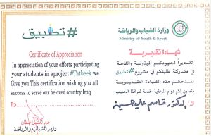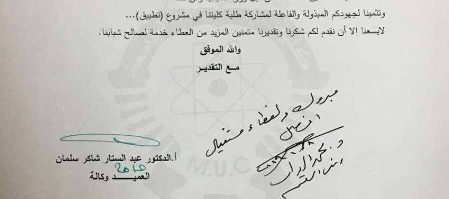 The lecturer Dr. Qassim Ali Hussain in the Civil Engineering Department received an appreciation certificate presented by the Minister of Youth and Sports Mr. Abdul-Hussein Abtaan in appreciation of the efforts exerted and effective for the participation of the students of Al-Mansour University College / Department of Civil Engineering in the application project. On the basis of the certificate, Dr. Abdul Sattar Shaker Salman, Dean of Al-Mansour university College, presented a letter of thanks and appreciation to the efforts exerted. On this occasion, the Department of Civil Engineering at Al-Mansour University College congratulates this achievement.