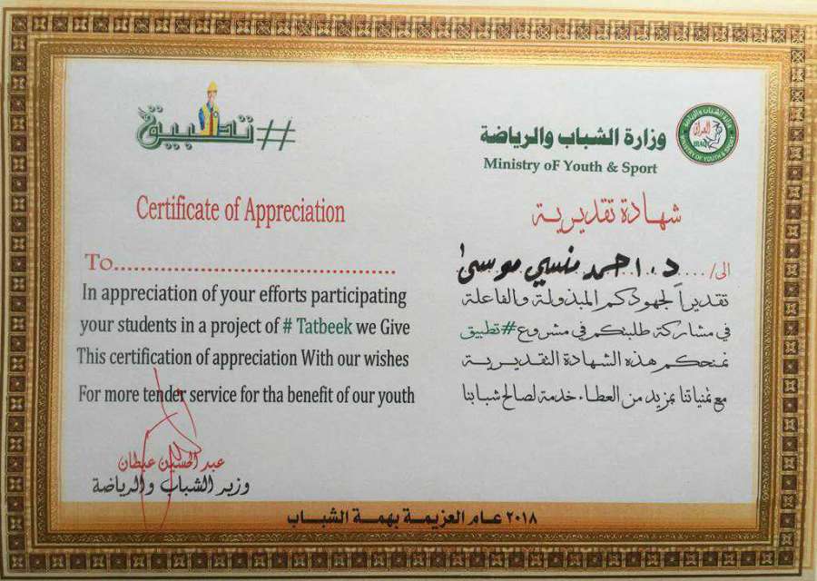 حصل الدكتور احمد منسي موسى التدريسي في قسم الهندسة المدنية على شهادة تقديرية مقدمة من قبل وزير الشباب والرياضة السيد عبدالحسين عبطان تثمينا للجهود المبذولة والفاعلة لمشاركة طلبة كلية المنصور/قسم الهندسة المدنية في مشروع تطبيق واستنادا الى الشهادة التقديرية منح الدكتور عبدالستار شاكر سلمان عميد كلية المنصور كتاب شكر وتقدير تثمينا للجهود المبذولة وفي هذه المناسبة يبارك قسم الهندسة المدنية في كلية المنصور الجامعة هذا الإنجاز.