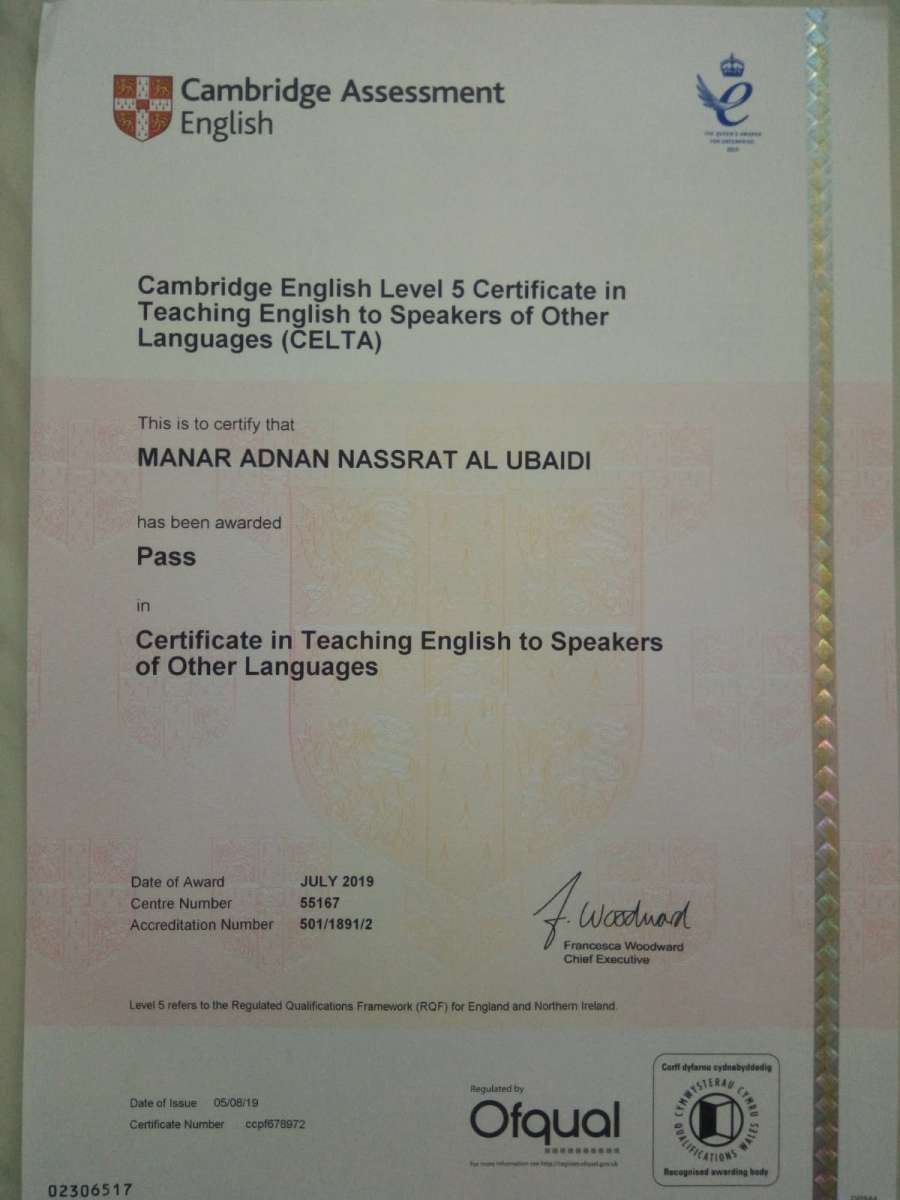 وحصلت على شهادة (CELTA) في اللغة الانكليزية