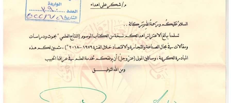 Assistant Professor Dr. Medhat Kazem Al-Quraishi - Head of the Department of Accounting and Banking Sciences at Al-Mansour University College, received a letter of thanks from His Excellency the Minister of Higher Education and Scientific Research for his book titled (Scientific Production), which contains research, studies, and articles in the fields of industry, trade, and economy during the period of his work and professional activity. And the academic, which ran from 1979 to 2018