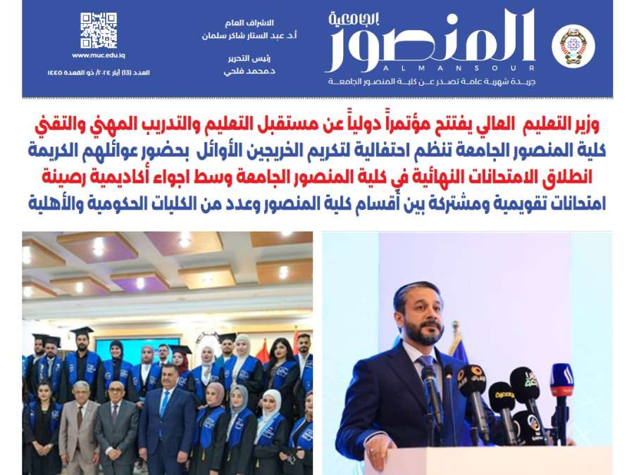 صدر العدد الجديد من جريدة ( المنصور الجامعية) التي تصدرها كلية المنصور الجامعة وتضمن العدد 13 لشهر أيار ٢٠٢٤ اخبار ونشاطات جامعية ومقالات ثقافية وعلمية وقانونية واجتماعية متنوعة بأقلام التدريسيين والطلبة ، وتنشر الجريدة شهريا بطبعتين إلكترونية وورقية .
