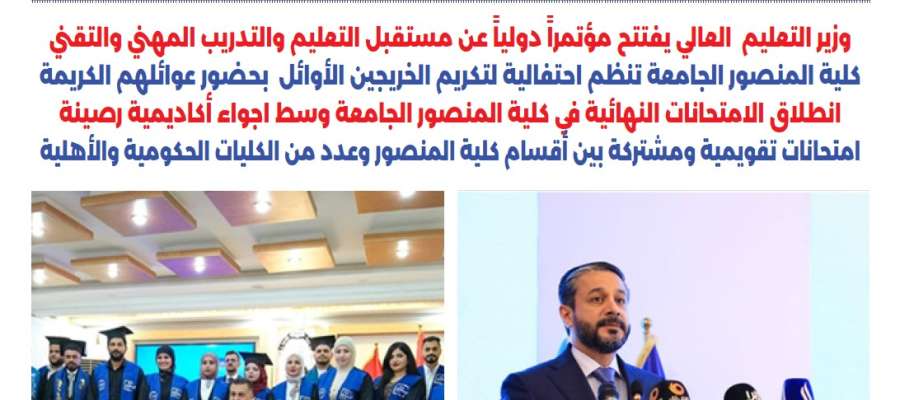 The new issue of Al-Mansour University newspaper, issued by Al-Mansour University College, was published. Issue 13 for May 2024 included university news and activities and various cultural, scientific, legal, and social articles by faculty and students. The newspaper is published monthly in two electronic and paper editions.